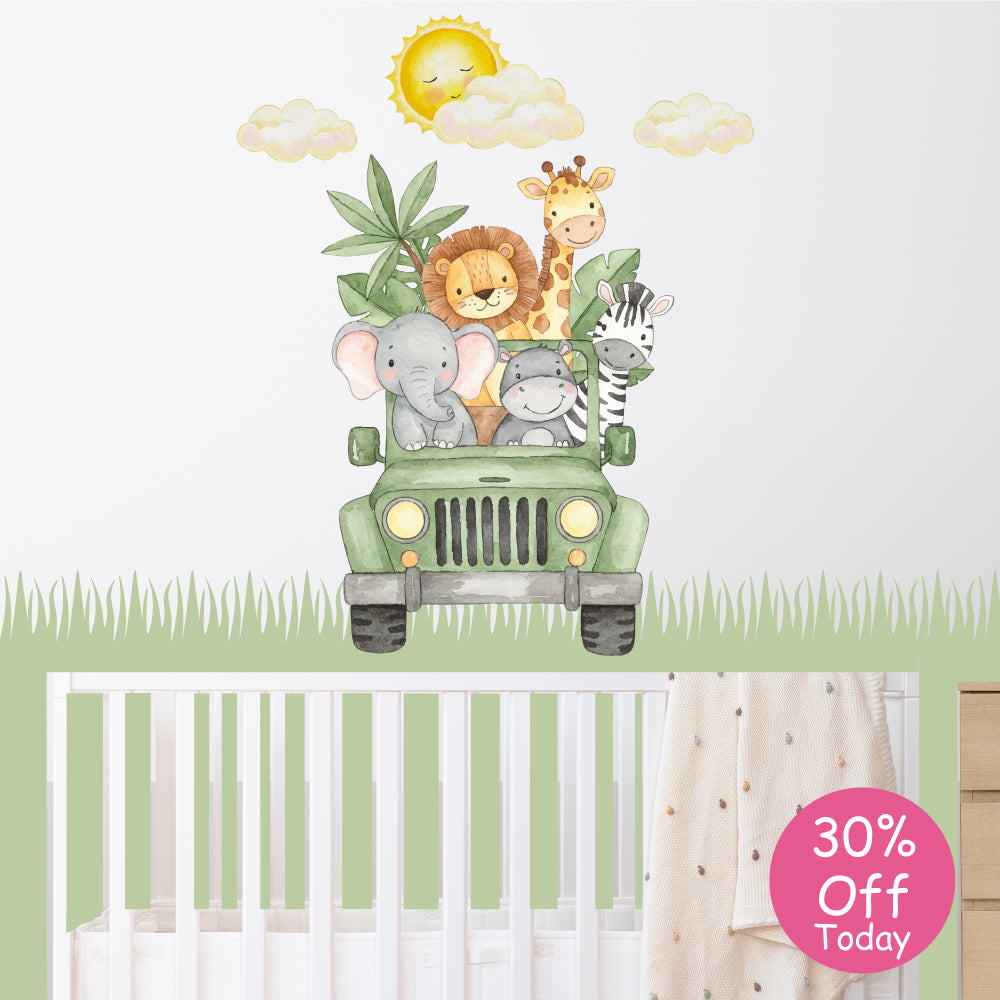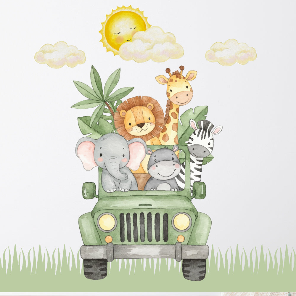 Embark on a safari adventure with our cute jungle animals as they journey together in their safari jeep. This delightful, hand-drawn watercolour illustration brings a sense of fun and curiosity to your little one’s nursery. Printed on high-quality, textured self-adhesive fabric, it beautifully captures the look and feel of a hand-painted mural, the perfect finishing touch for creating a warm, imaginative space for your baby.
