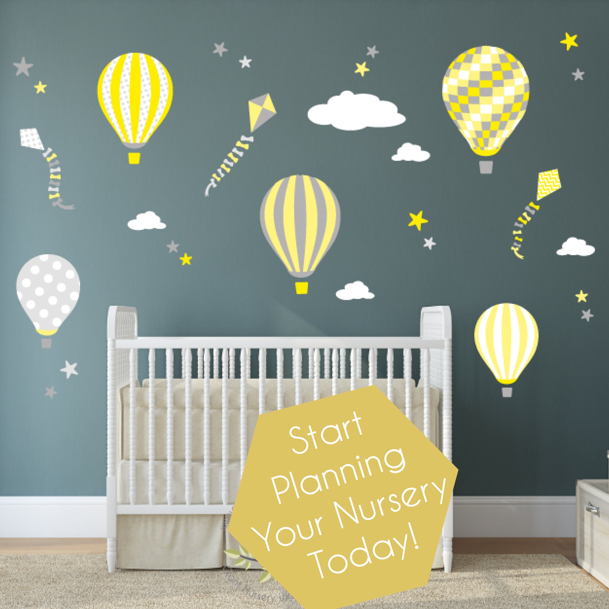 Fly high among the clouds and stars with our hot air balloons and kites nursery wall stickers featuring different sized balloons, kites, stars in gender neutral colours suitable for either a baby boys or girls nursery room. Simply peel and stick our premium self adhesive fabric wall decals to create a magical space within hours.