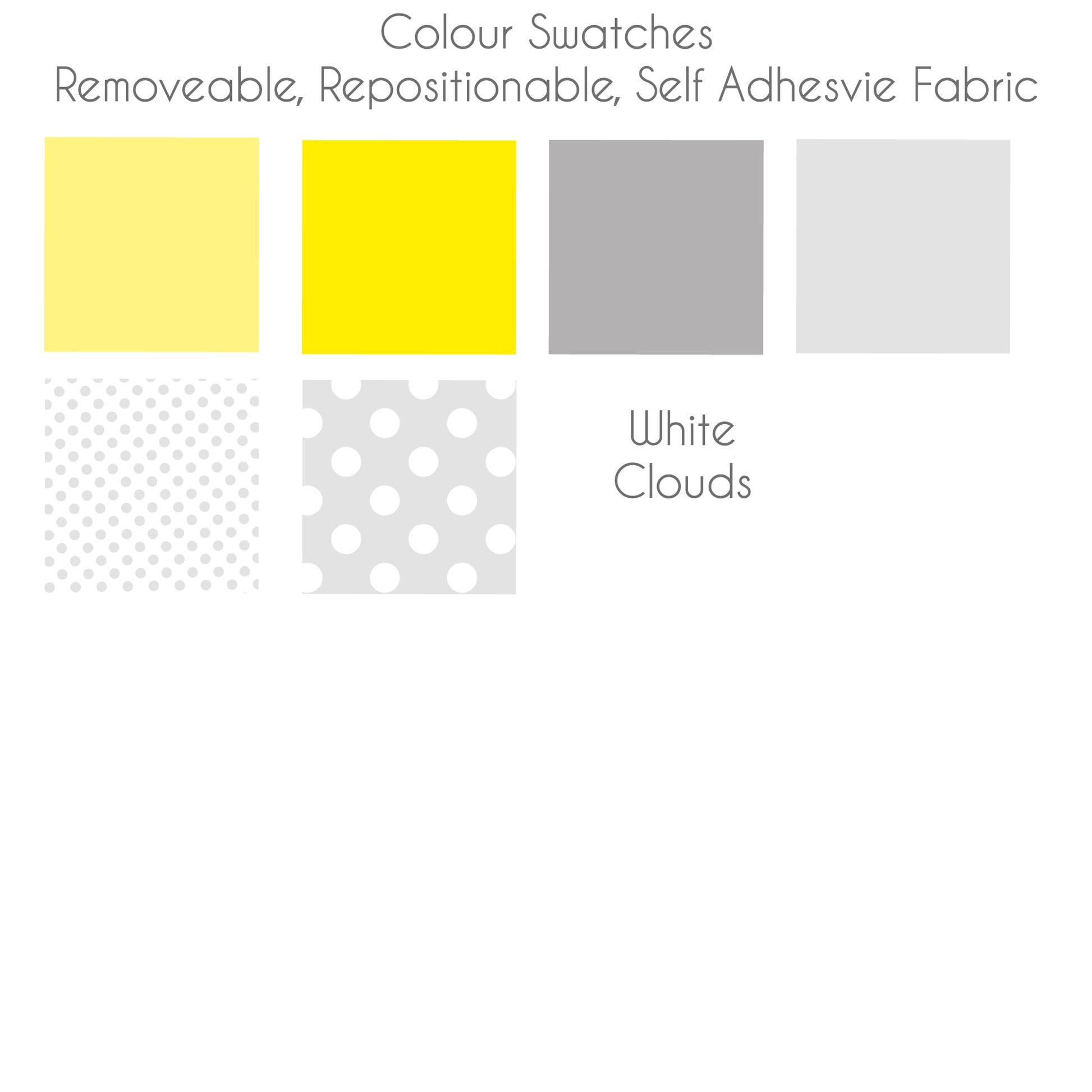 Included in this design are self-adhesive extremely high quality textured fabric nursery wall stickers for applying to any smooth surface. Our stickers can be repositioned and removed leaving no residue on the surface.