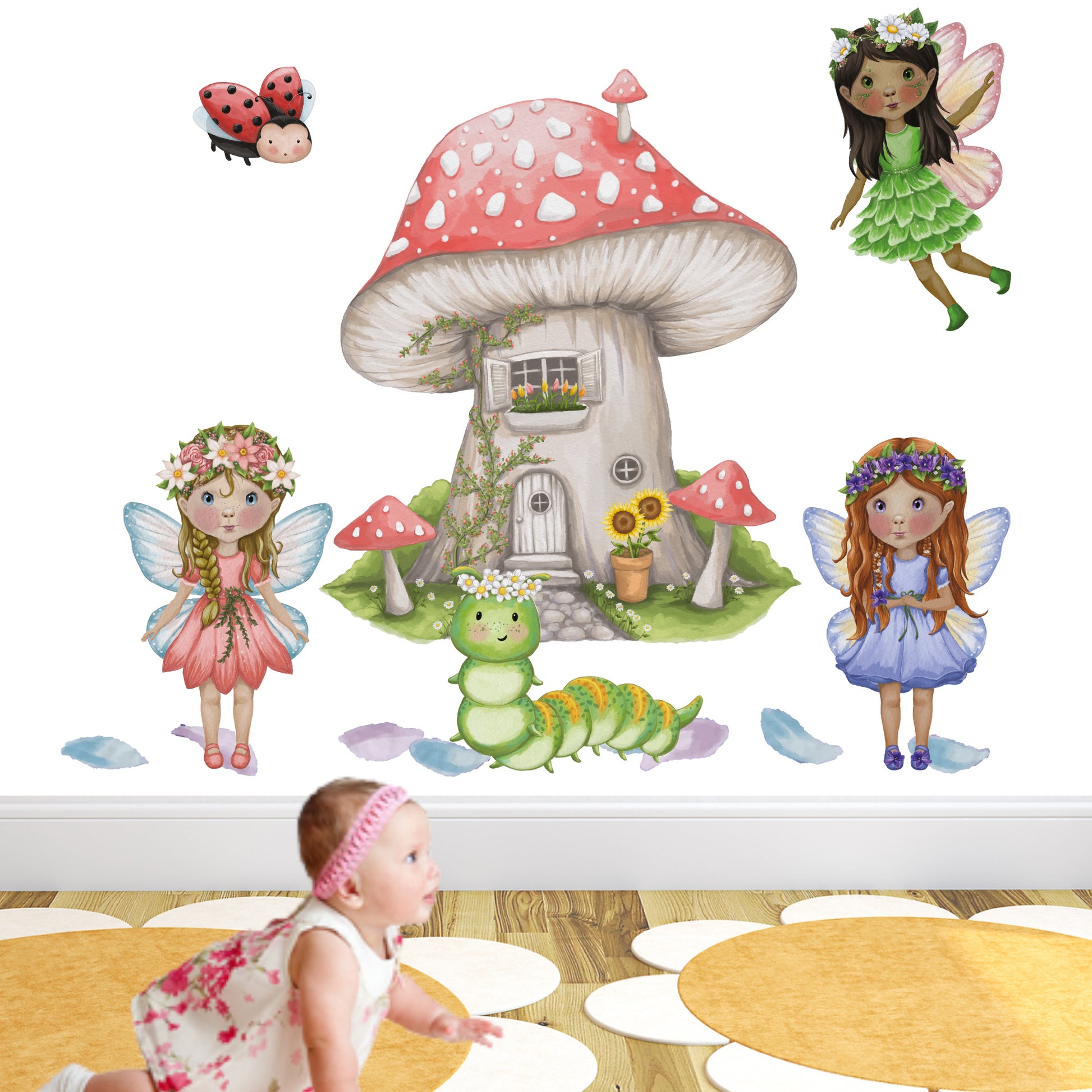 Bright colourful hand drawn children's watercolour flower fairy illustrations printed on textured self adhesive fabric giving it that perfect hand painted look and feel in your baby's nursery. Featuring our cute flower fairies and a magical mushroom home.