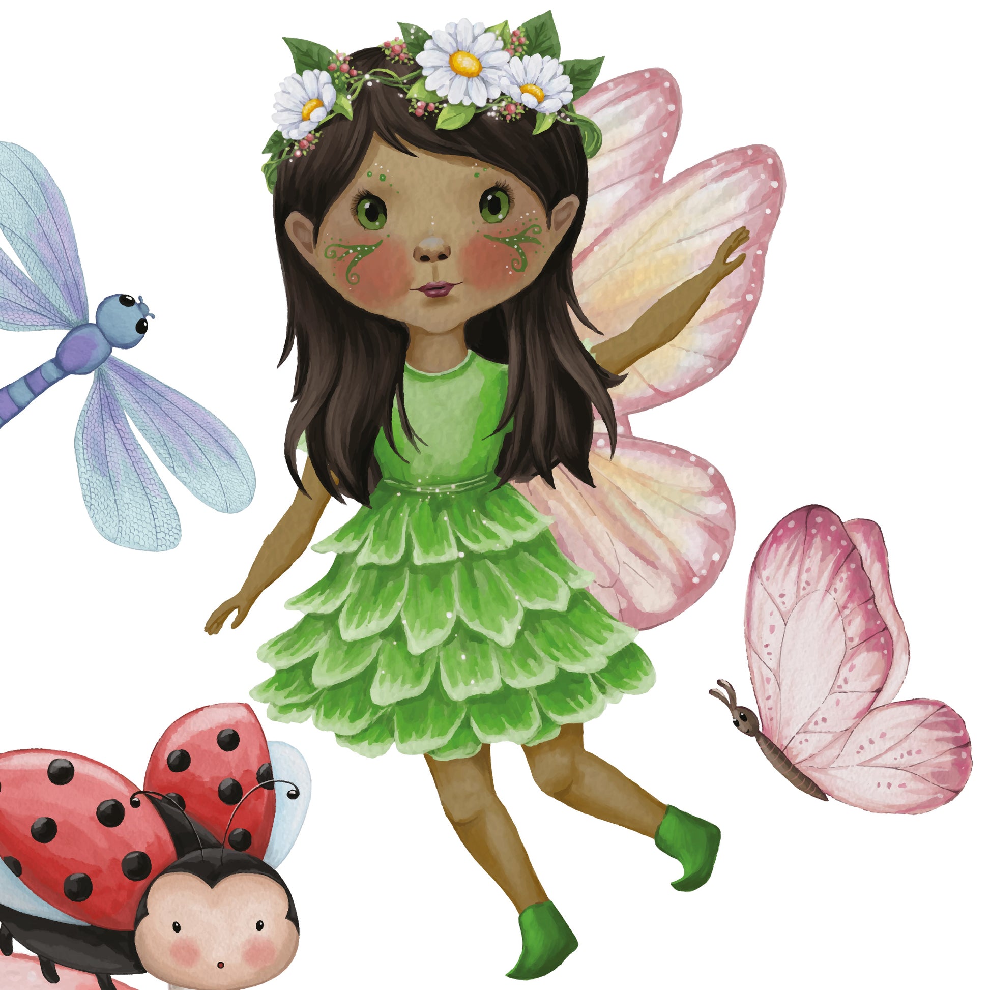Bright colourful hand drawn children's watercolour flower fairy illustrations printed on textured self adhesive fabric giving it that perfect hand painted look and feel in your baby's nursery. Featuring our three cute flower fairies.