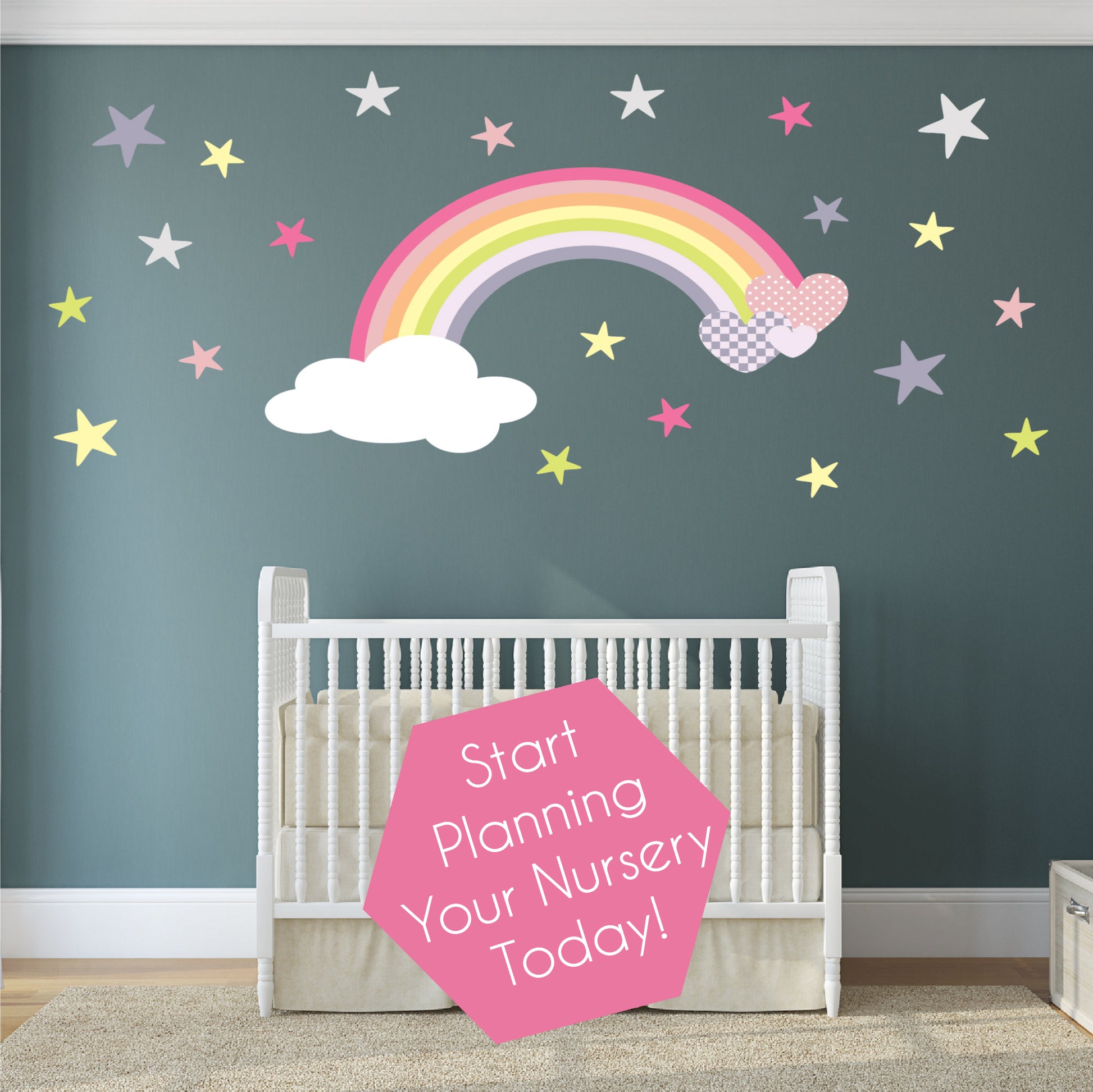 Large Rainbow, Hearts and Stars Nursery Wall Stickers featuring a colourful rainbow with hearts, clouds and twinkling bright stars in gentle pastel colours perfect for adding an enchanting touch to your baby girls nursery room.