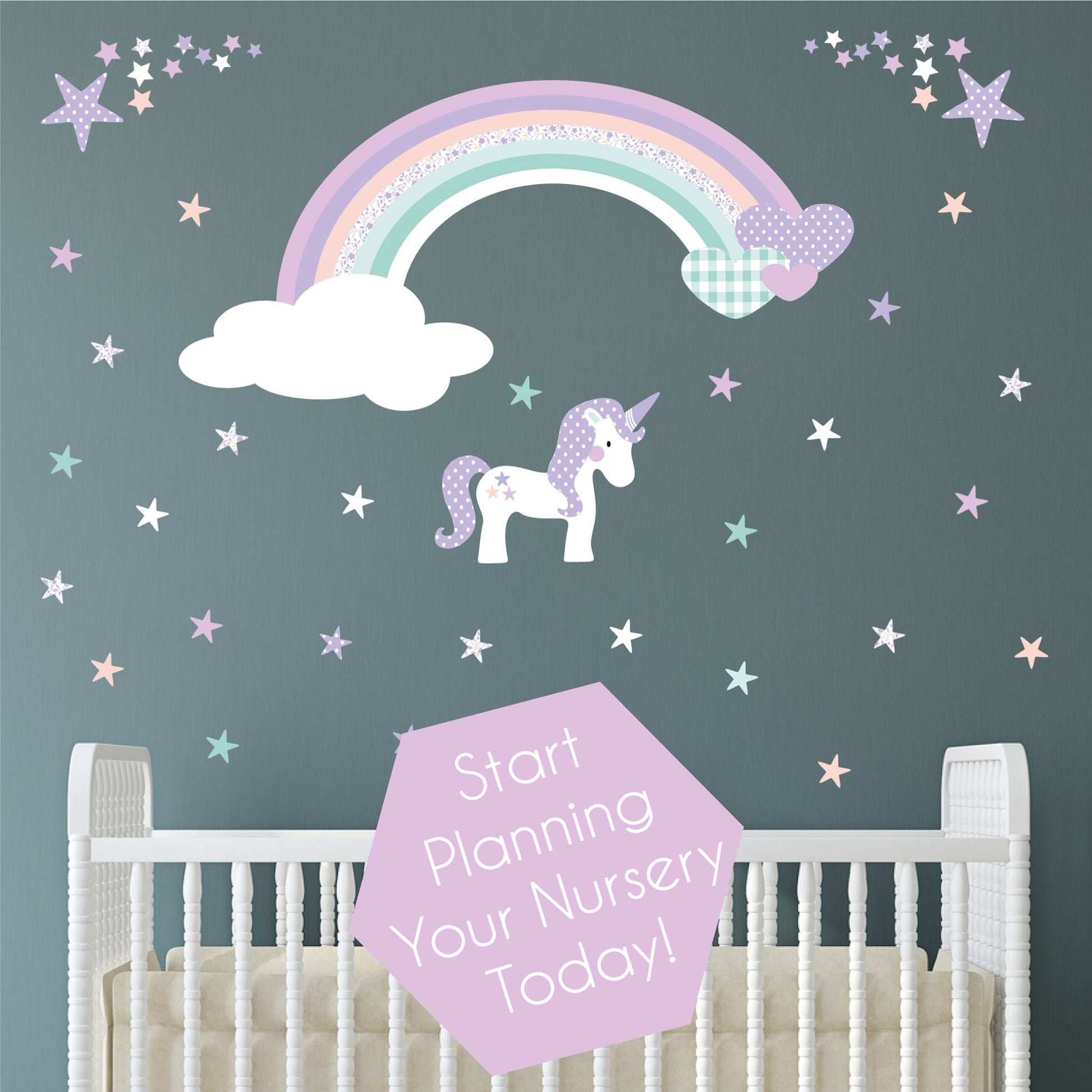 An enchanting Unicorn and Rainbow with Hearts and Stars Wall stickers for a baby girls nursery room.