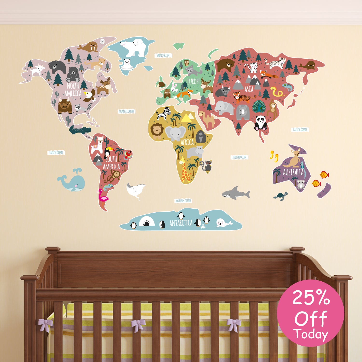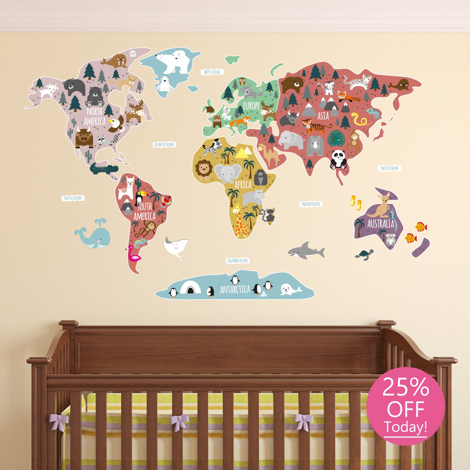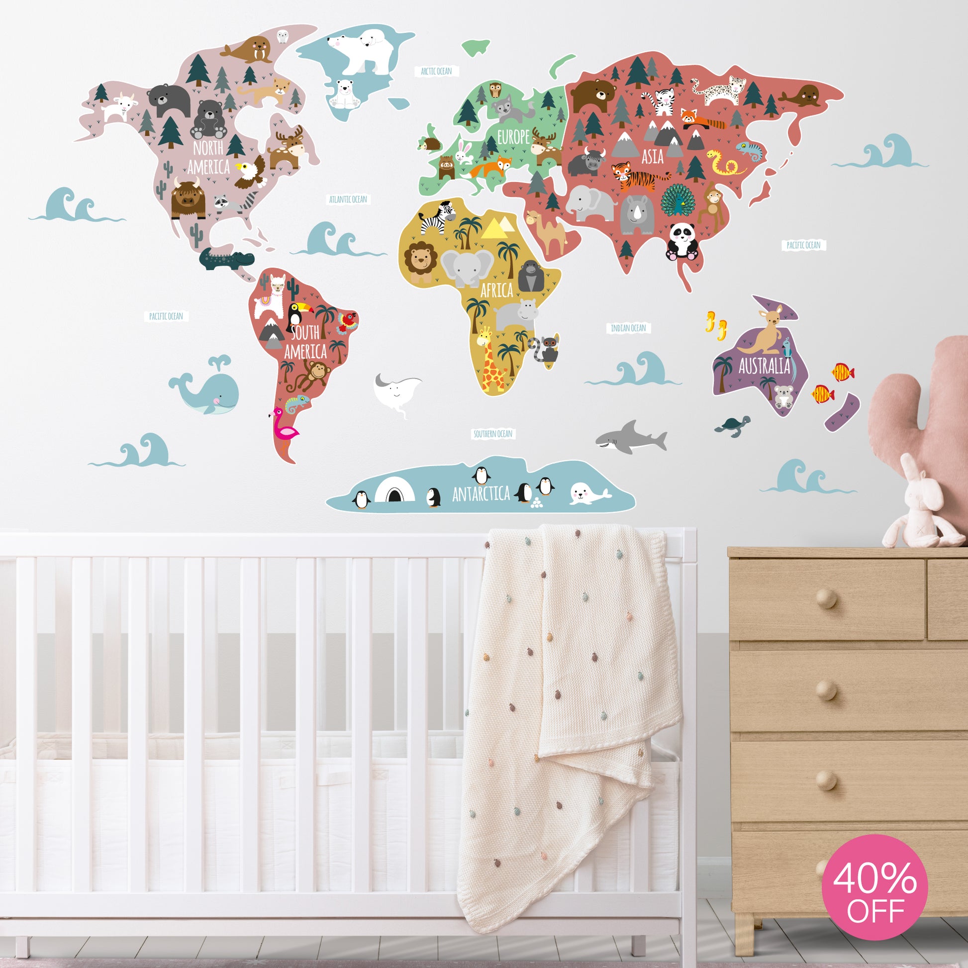 Captivate your growing child's imagination with our fantastic children's map of the world wall decals featuring lots of animals from all corners of the globe.