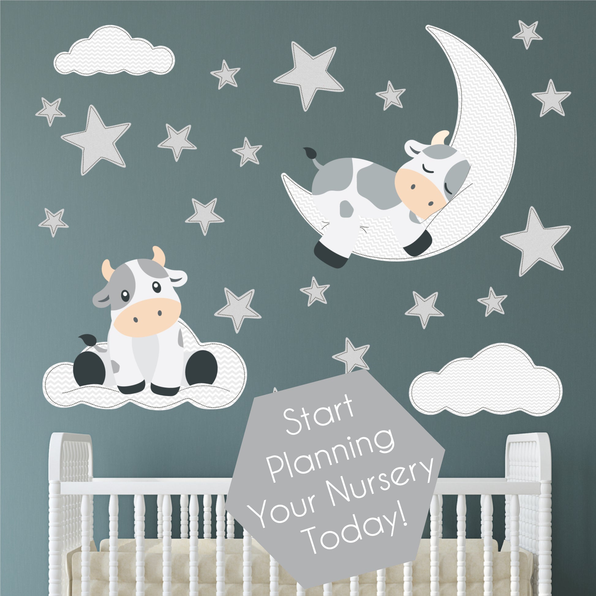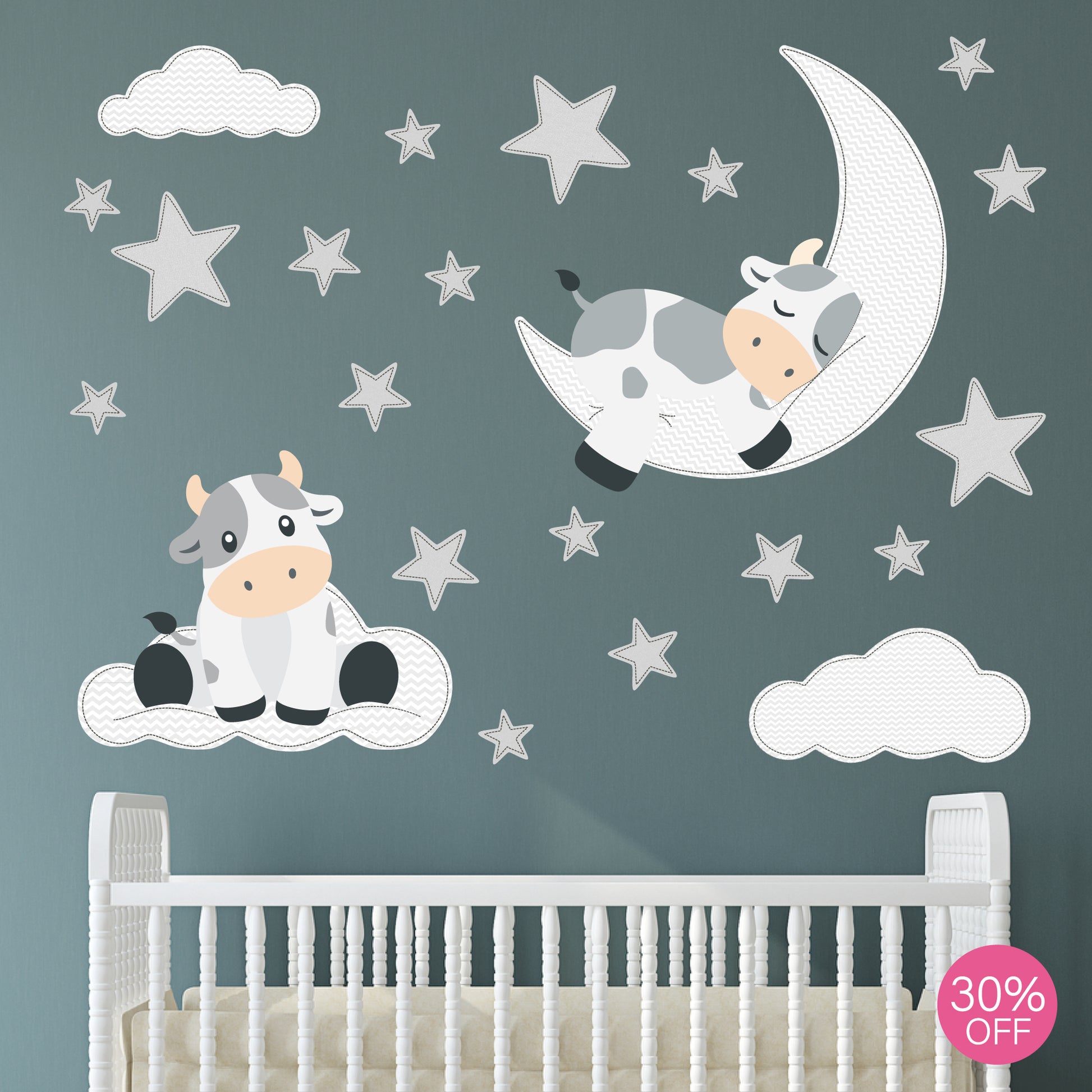 They're cuddly and cute, and so much fun - Premium self adhesive fabric nursery wall decals featuring a sleeping moo cow on a squishy moon, a bouncing cow on a fluffy cloud with lots of twinkling stars.