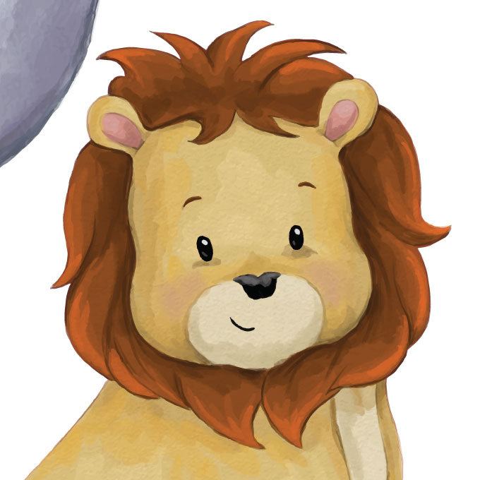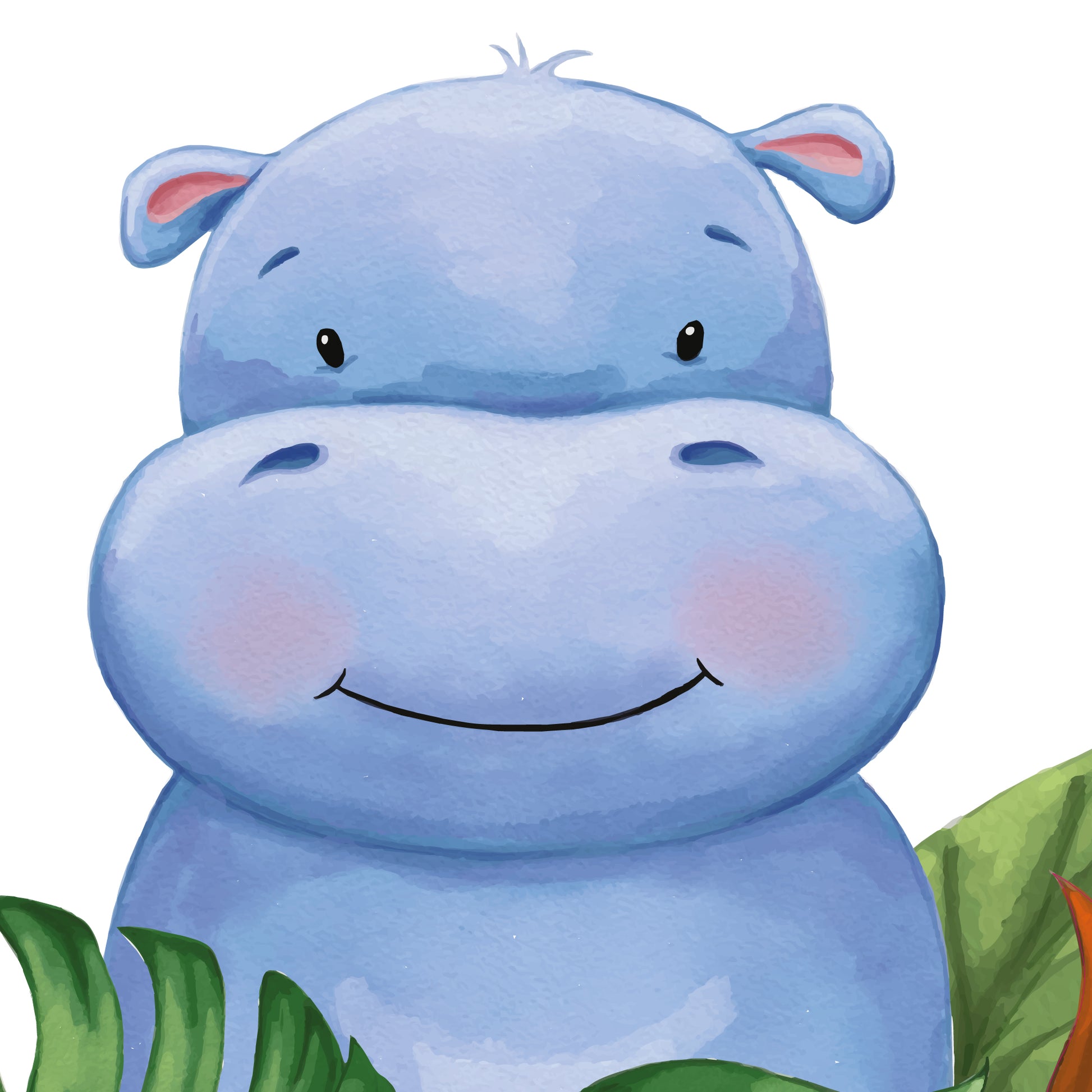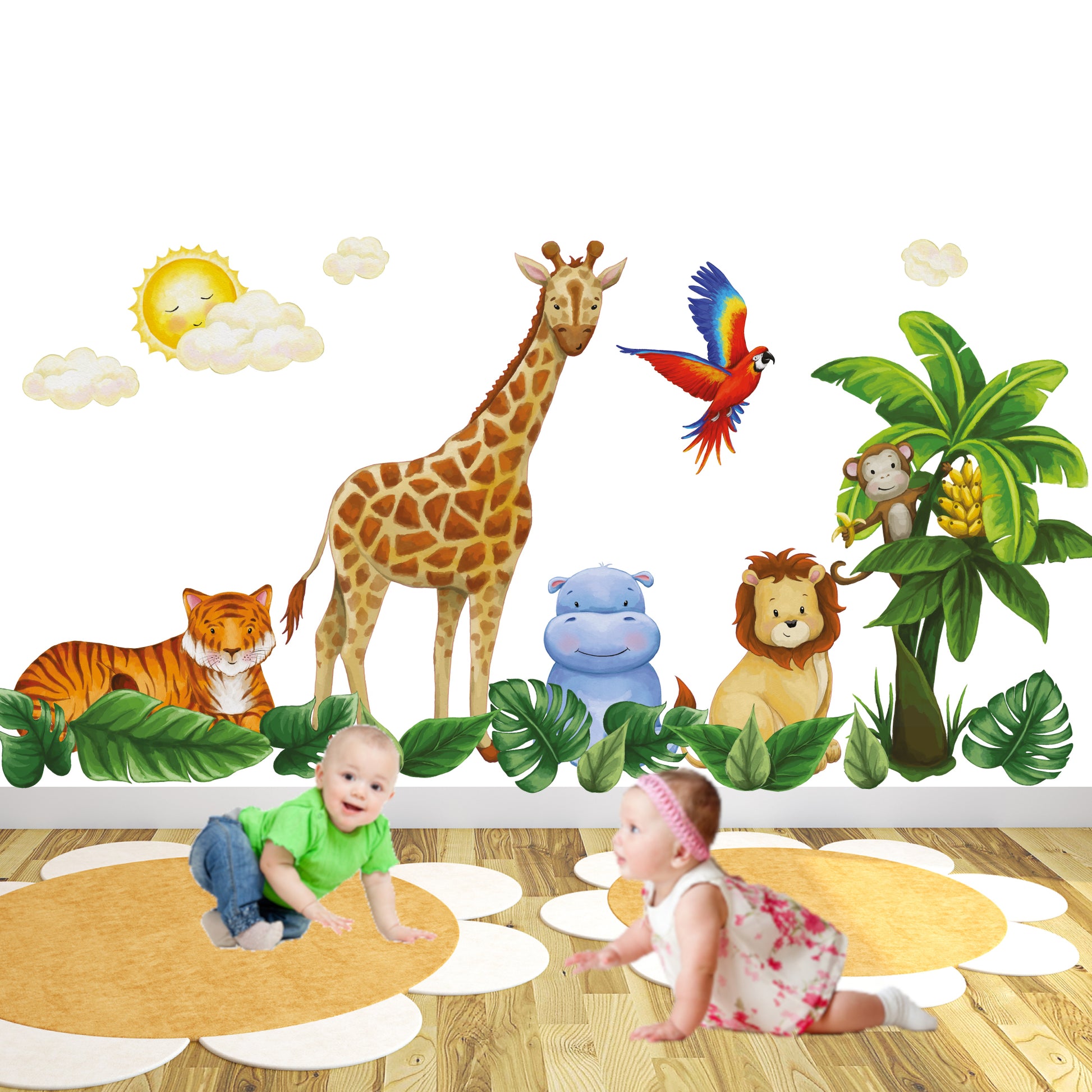 Bright colourful hand drawn children's watercolour jungle animal illustrations printed on textured self adhesive fabric giving it that perfect hand painted look and feel in your baby's nursery. Featuring a tiger, giraffe, hippo, lion, parrot and monkey in a banana tree.
