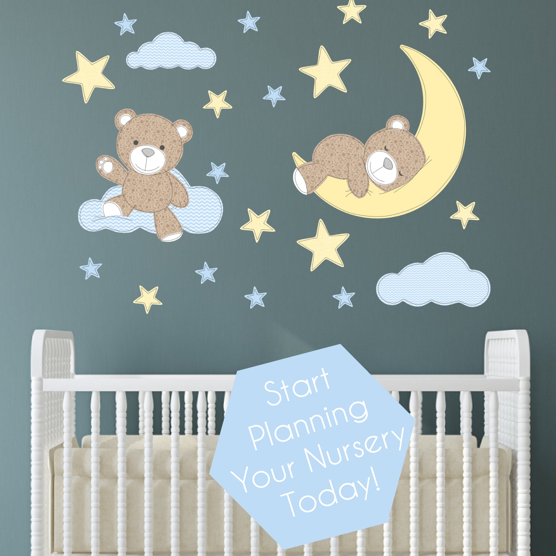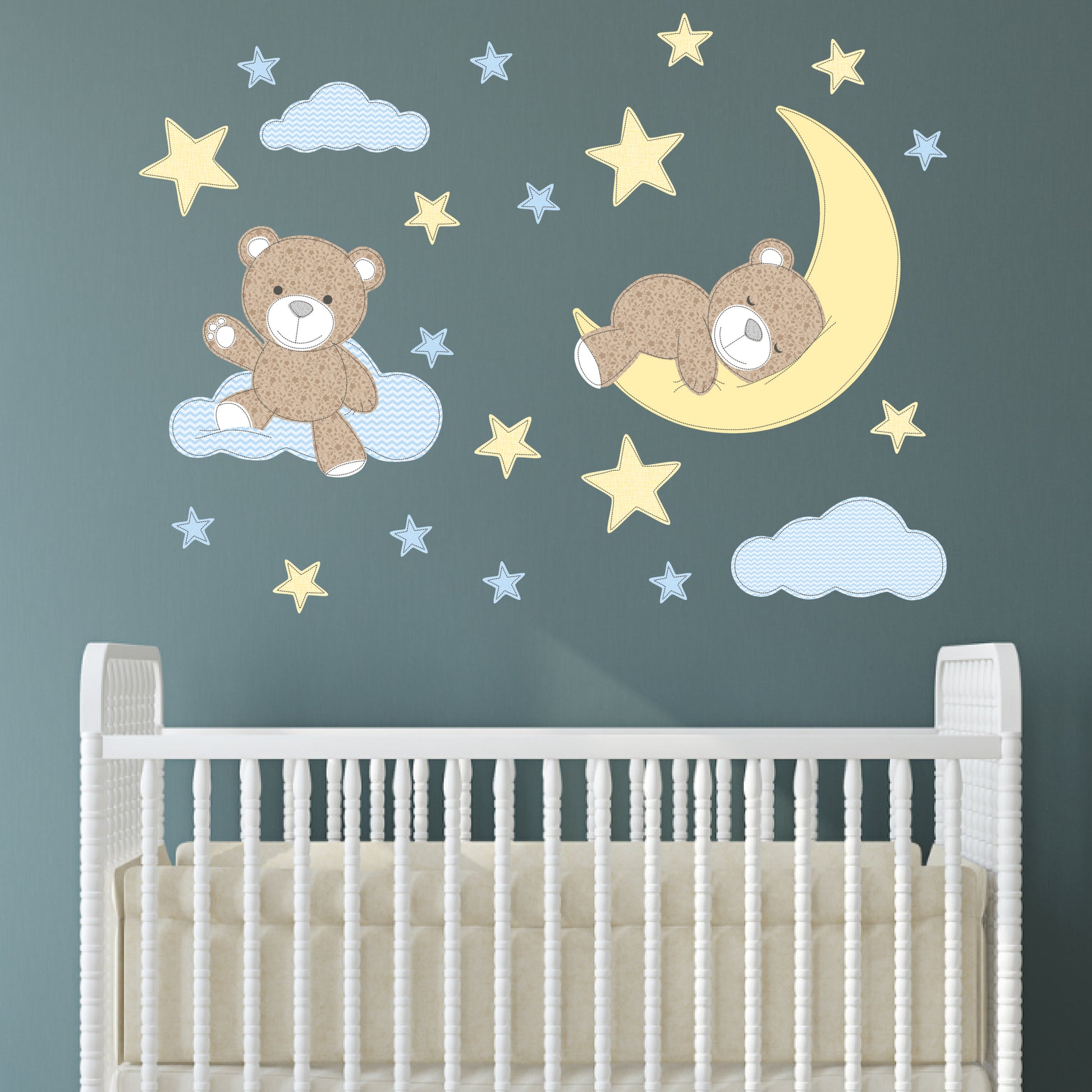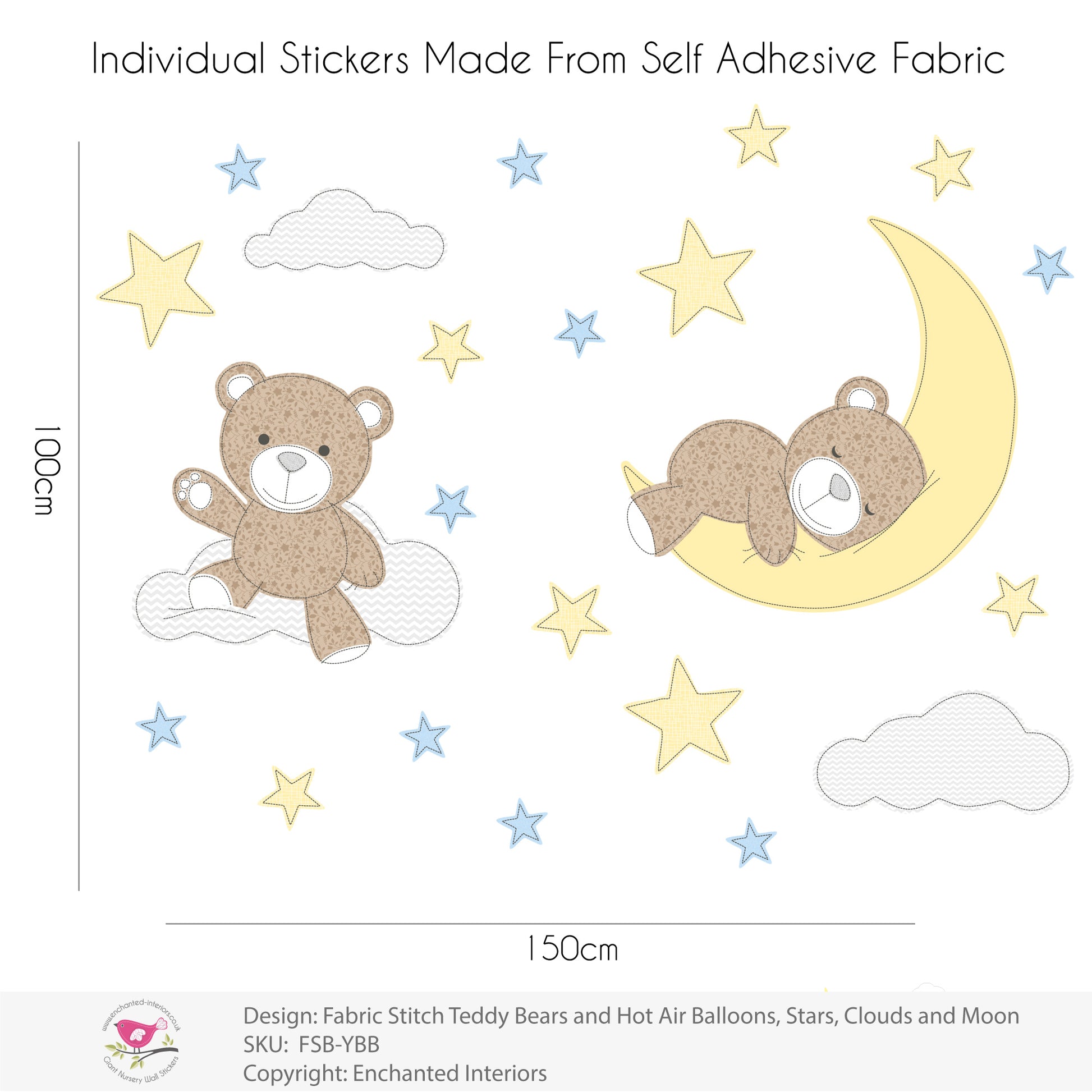 They're cuddly and cute, and so much fun - Premium self adhesive fabric nursery wall decals featuring a sleeping teddy bear on a squishy moon, a bouncing bear on a fluffy cloud and lots of twinkling stars.